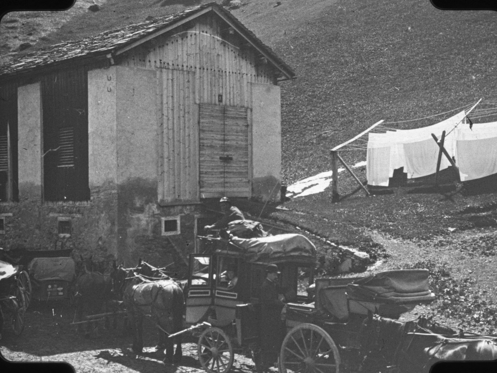 Während ihrer Reise in die Dolomiten legten die Reisenden am Rollepaß eine Pause ein; dieses Mal wurden die Pferde nicht nur versorgt, sondern auch gewechselt. Die Kutscher der verschiedenen Reisegruppen mussten warten, bis sie an der Reihe waren. Die Pferdekutsche von Olga und Anton Landsiedl hatte ein geschlossenes Abteil und hinten Sitzbänke mit einem Baldachin – eine typische Postkutsche eben. An dem Tag wäre ein Platz im offenen Teil der Kutsche schön gewesen, denn es war sonnig und die Luft war mild.