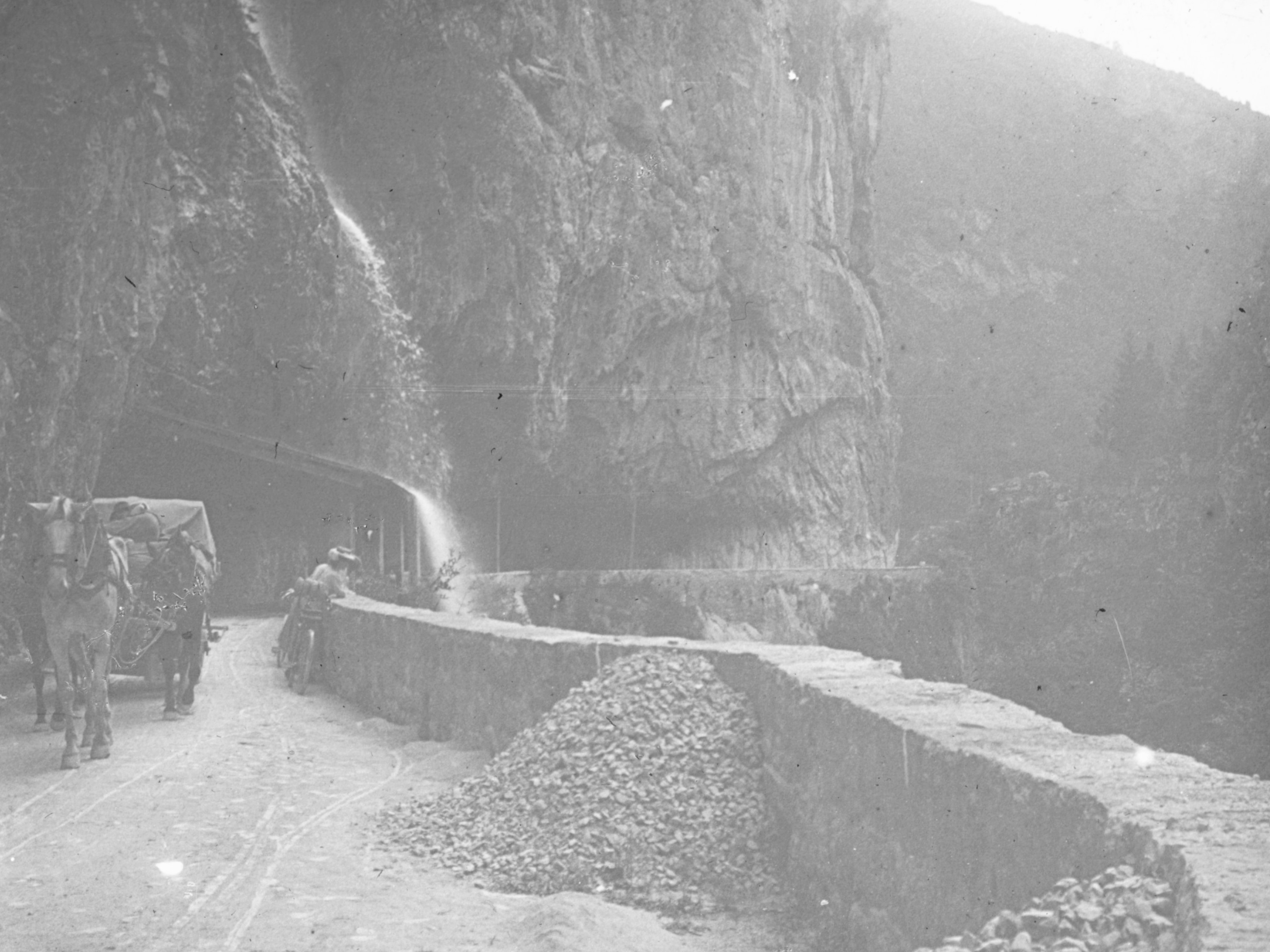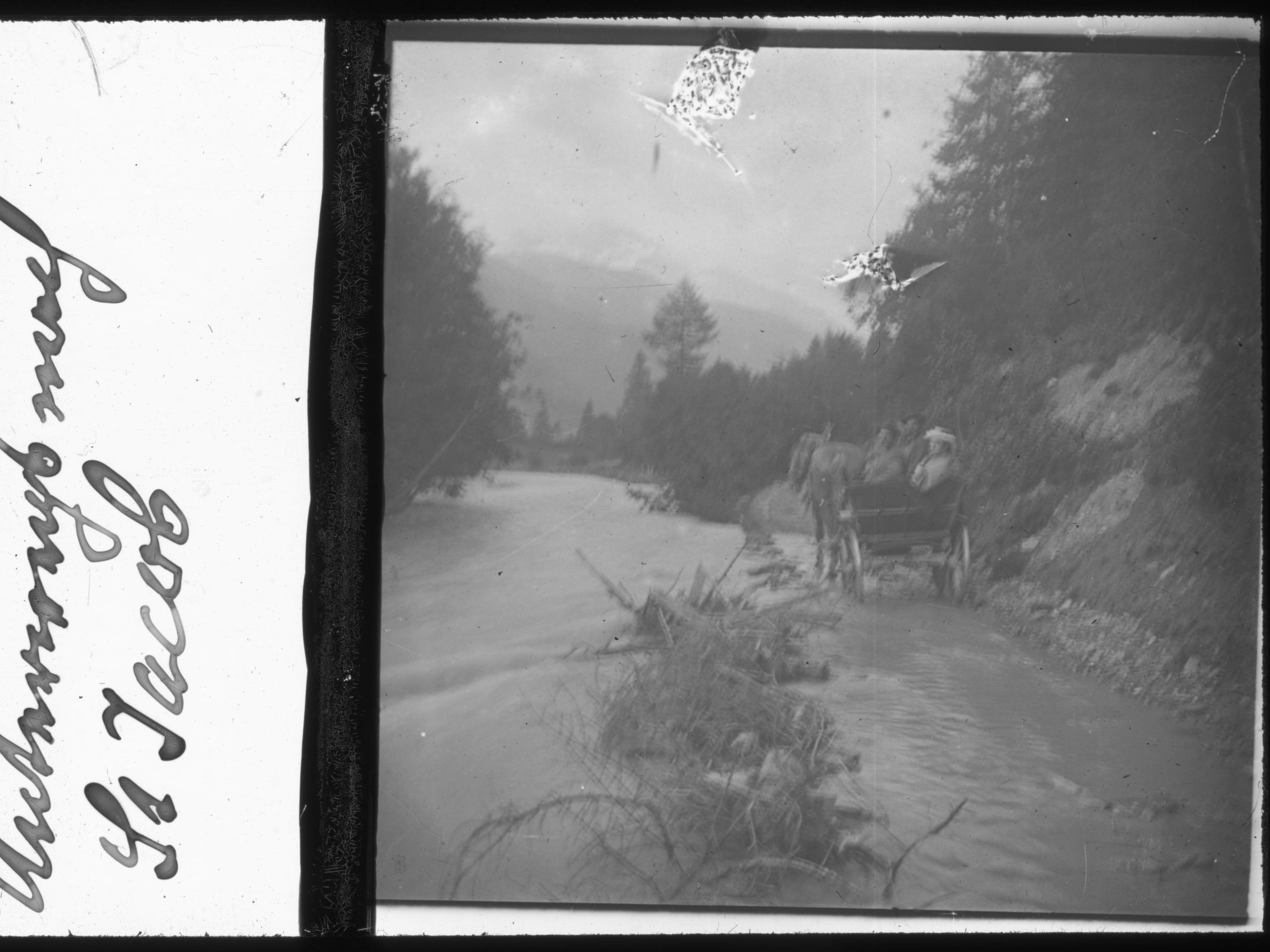 In der Sommerfrische waren immer wieder abwechslungsreiche Tagesausflüge und Wanderungen auf dem Programm. Die Landsiedls waren aktive Mitglieder im Österreichischen Alpenverein und haben Salzburg, Oberösterreich, Tirol und die Steiermark erwandert. Im Tal der Schwarzach bei Sankt Jakob im Defereggental gab es Wasserfälle, Bäche und sogar eine Schwefelquelle zu entdecken. Der Rückweg nach starken Regenfällen erwies sich als riskantes Abenteuer: Mit ihrer Kutsche ist die Gruppe beinahe im überfluteten Bach stecken geblieben. Anton Landsiedl hat die Gelegenheit beim Schopf gepackt um wieder einmal ein originelles Reisefoto zu schießen.