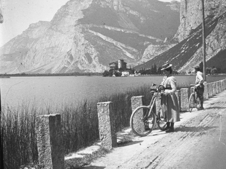1899 begleiten wir das Ehepaar Landsiedl auf ihrer Tour zum Toblinosee nördlich des Gardasees im Trentino. Sie hatten ihre neuen Fahrräder mitgenommen, um von der Höhe ins Tal zu fahren. Im Gegensatz zu den Fahrrädern der Arbeiter in den Städten waren diese Räder stabiler und daher auch kostspieliger. Am See packte Anton sein Fotoequipment aus, um seine Ehefrau Olga mit Rad und der Burg Toblino im Hintergrund zu fotografieren.