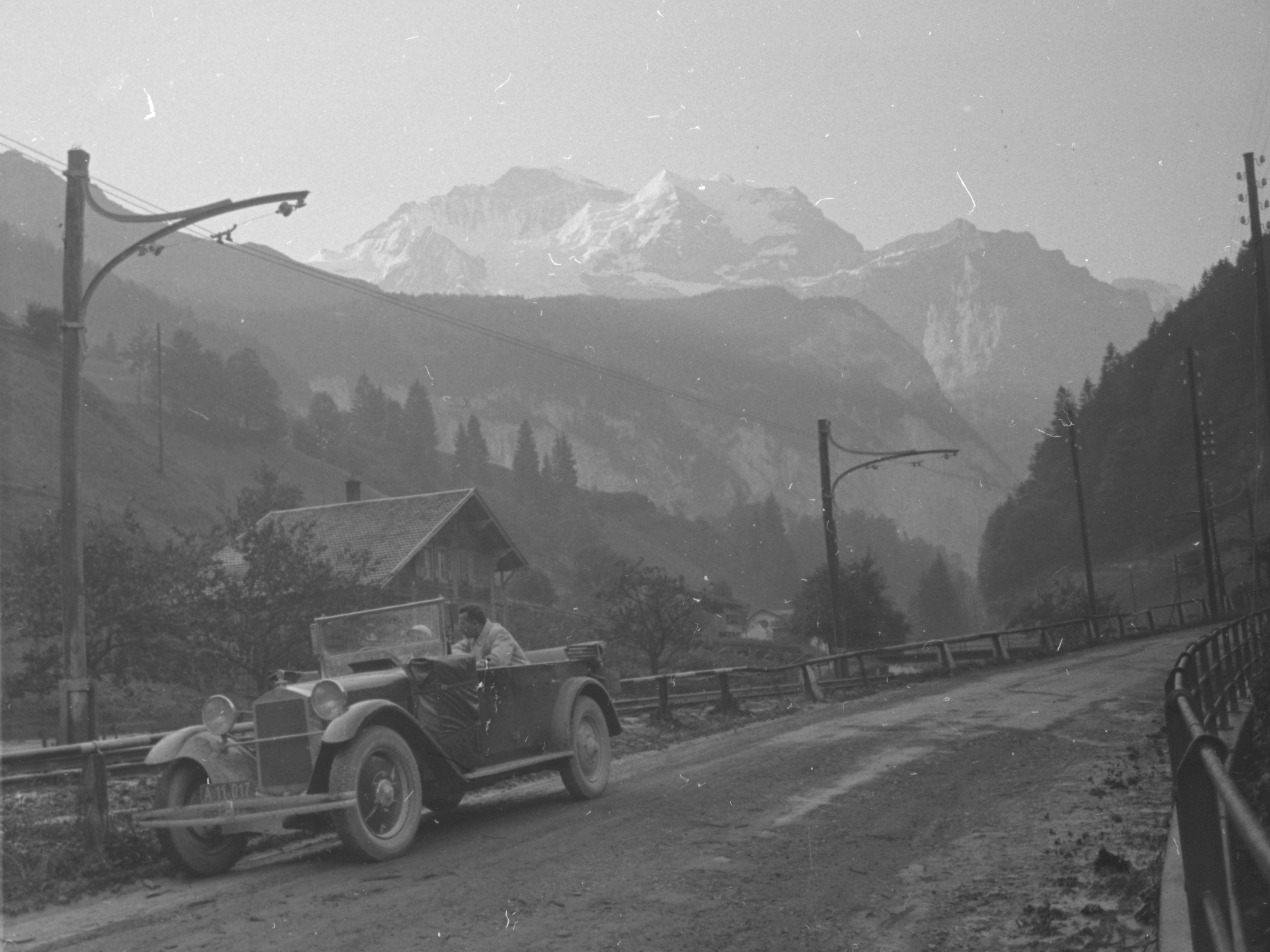 Im Jahr 1911 ging es für die Landsiedls in die Schweizerer Dolomiten. Die Fahrt mit dem Autobus war etwas ganz Besonderes und sehr bequem, obwohl der laute und stinkende Motor die Romantik etwas störte. Ob der Bus auf dem Foto ein regulärer Postbus war oder ob die Landsiedls eine sogenannte Lustfahrt mit einer geführten Reisegruppe gemacht haben, lässt sich nicht mehr genau sagen. Der Bus hatte jedenfalls kein Verdeck und Olga Landsiedl musste ihren Hut im Fahrtwind festhalten. Das moderne Fotoequipment der Landsiedls faszinierte alle Mitreisenden.