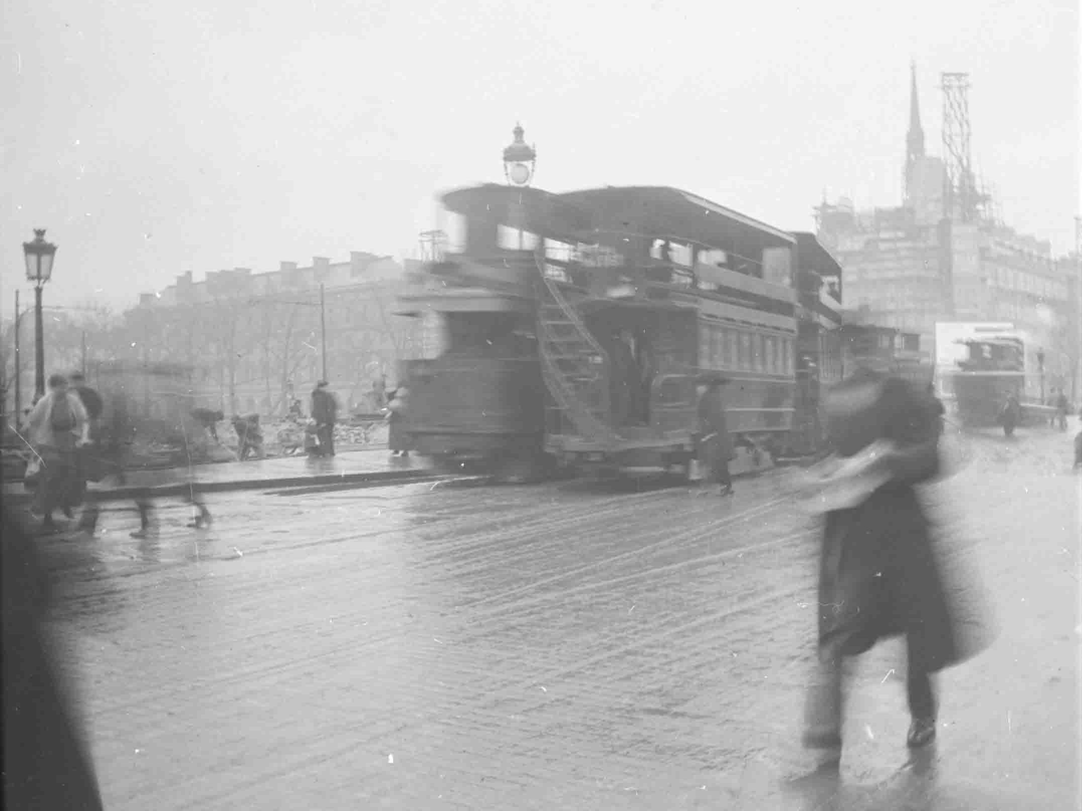 Trotz des Tagungsbesuchs und der Besichtigung der Turnhallen war noch genügend Zeit die Stadt der Liebe zu erkunden. Anton hat eine elektrische Straßenbahn der „Compagnie générale parisienne de tramways“ fotografisch festgehalten. In großen Städten ging das Leben immer schon deutlich schneller voran. Anton stand für diese Aufnahme wohl auf der Fahrspur und hat in der Eile die Belichtungszeit falsch eingestellt, daher sind Straßenbahn und Passanten etwas unscharf.