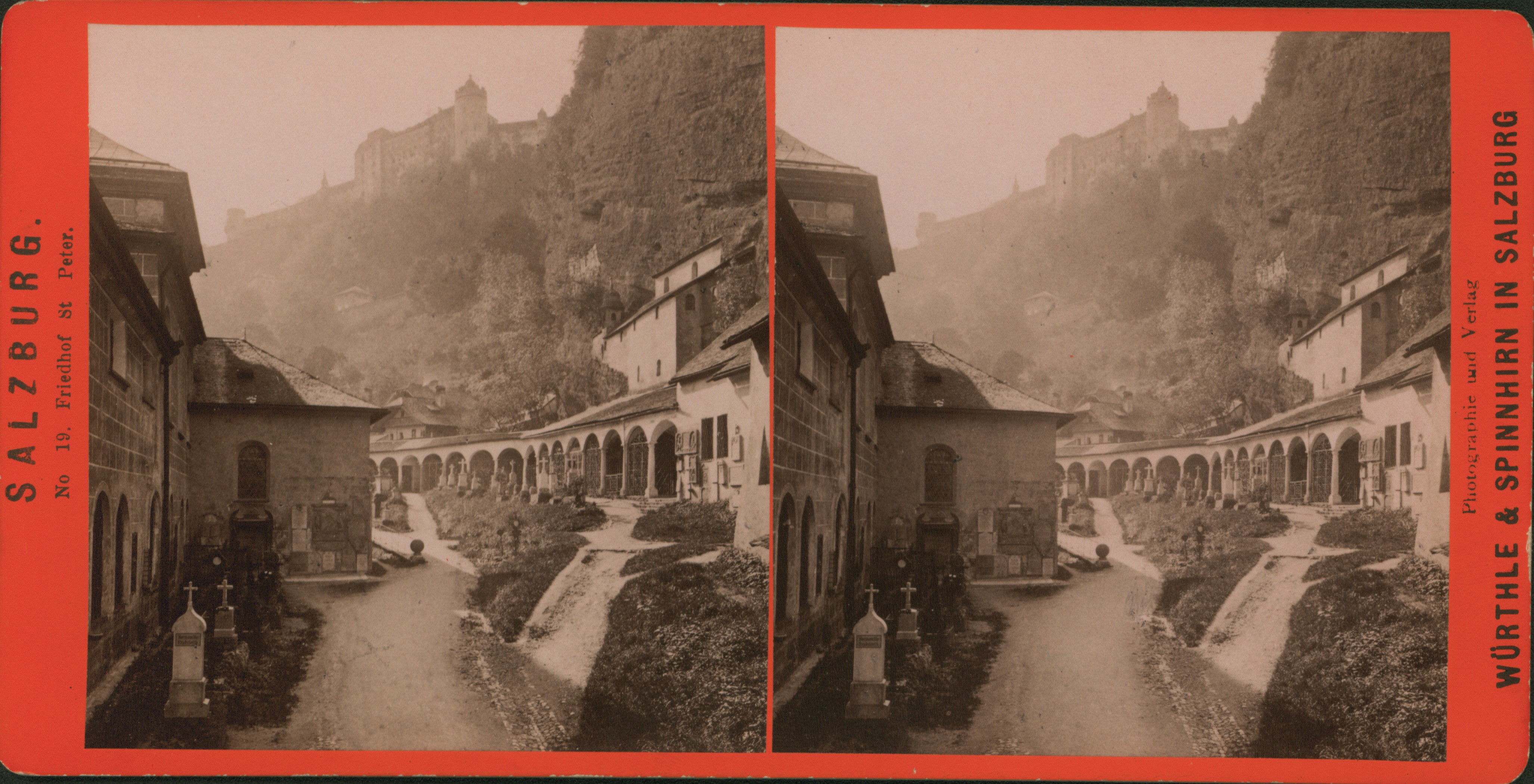 Die Familie Landsiedl hat ihrer Sammlung auch viele Kaufbilder hinzugefügt. Das waren Fotos, die man am Kiosk erwerben konnte – praktisch für Menschen, die keine eigene Fotokamera besaßen. Es gab auch Stereobilder zu kaufen, die mit den damals beliebten Stereobetrachtern angesehen werden konnten und einen 3D-Effekt erzeugten. Besonders schön fanden wir dieses Bild, es zeigt den Friedhof St. Peter in Salzburg.