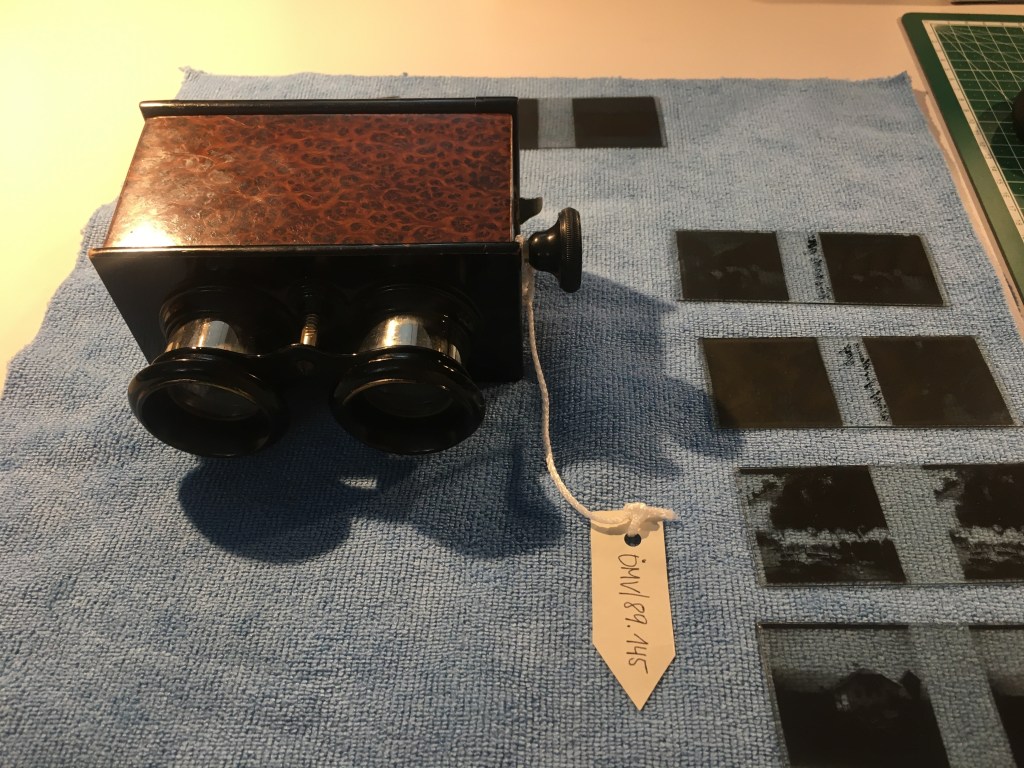 Die Wartezeit nutzte Anton um seine Stereokamera aufzustellen und ein Erinnerungsfoto zu machen. Als schließlich alles aufgebaut und eingestellt war, kam ein Passant daher und lief ihm ins Bild. Anton war ziemlich aufgebracht, die Glasplatten waren ja wertvoll und jede Aufnahme wollte wohlüberlegt sein!